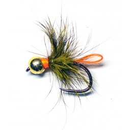Nymphe corps brun/kaki, tag orange, bouclette orange